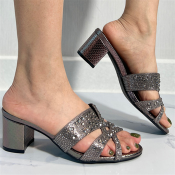 夏のミッドチャンキーヒールサンダルシャイニングクリスタルデザイナーの女性のハイヒールの靴と女性のパンプス